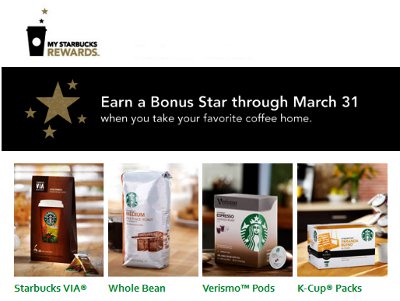 For a limited time, earn a Bonus Star every time you take home your favorite coffee and use your registered card to pay. Offer good at participating U.S Starbucks stores.
